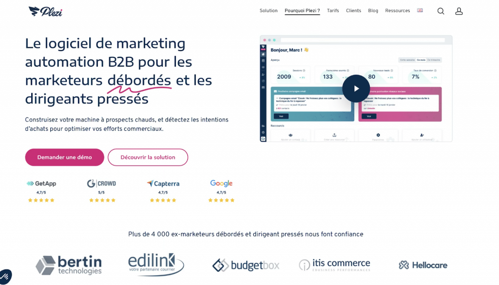 Plezi est un logiciel français conçu spécifiquement pour les besoins du marketing B2B. Il se concentre sur la gestion de campagnes de contenu automatisées et vous permet de mettre en place des scénarios de lead nurturing (relation progressive avec vos prospects), de segmenter vos prospects, d’analyser leur niveau de maturité et de diffuser automatiquement le bon contenu au bon moment.